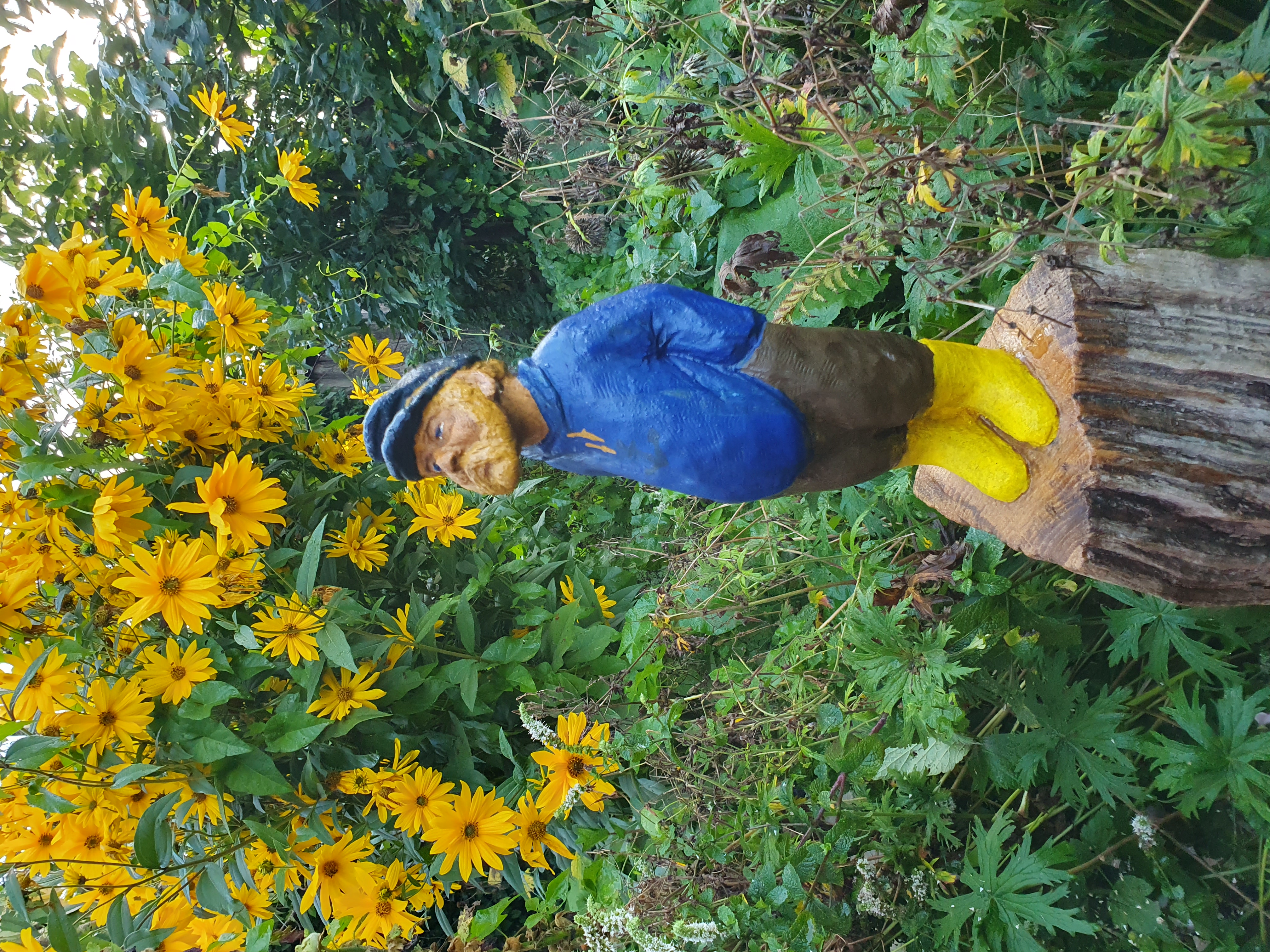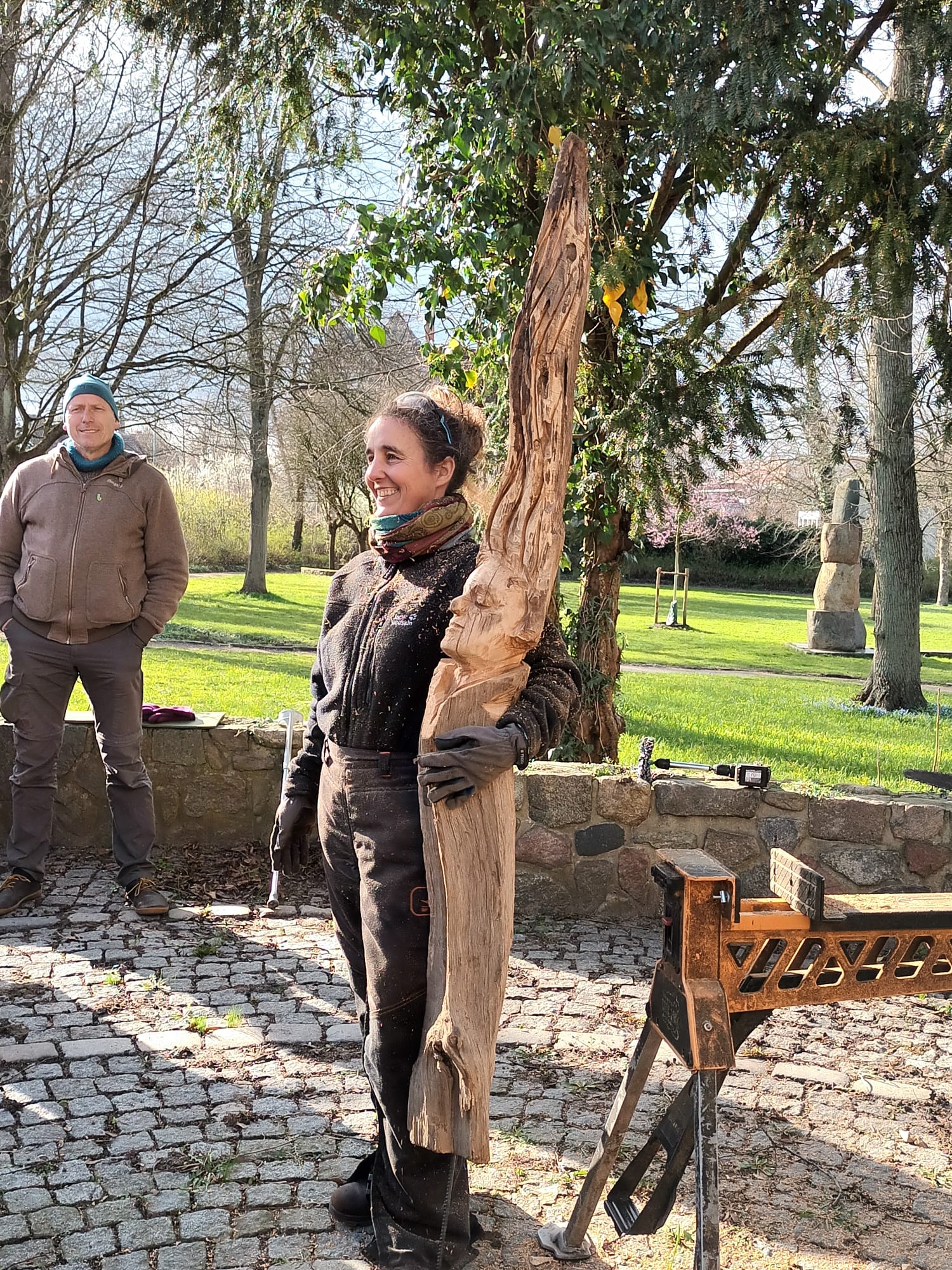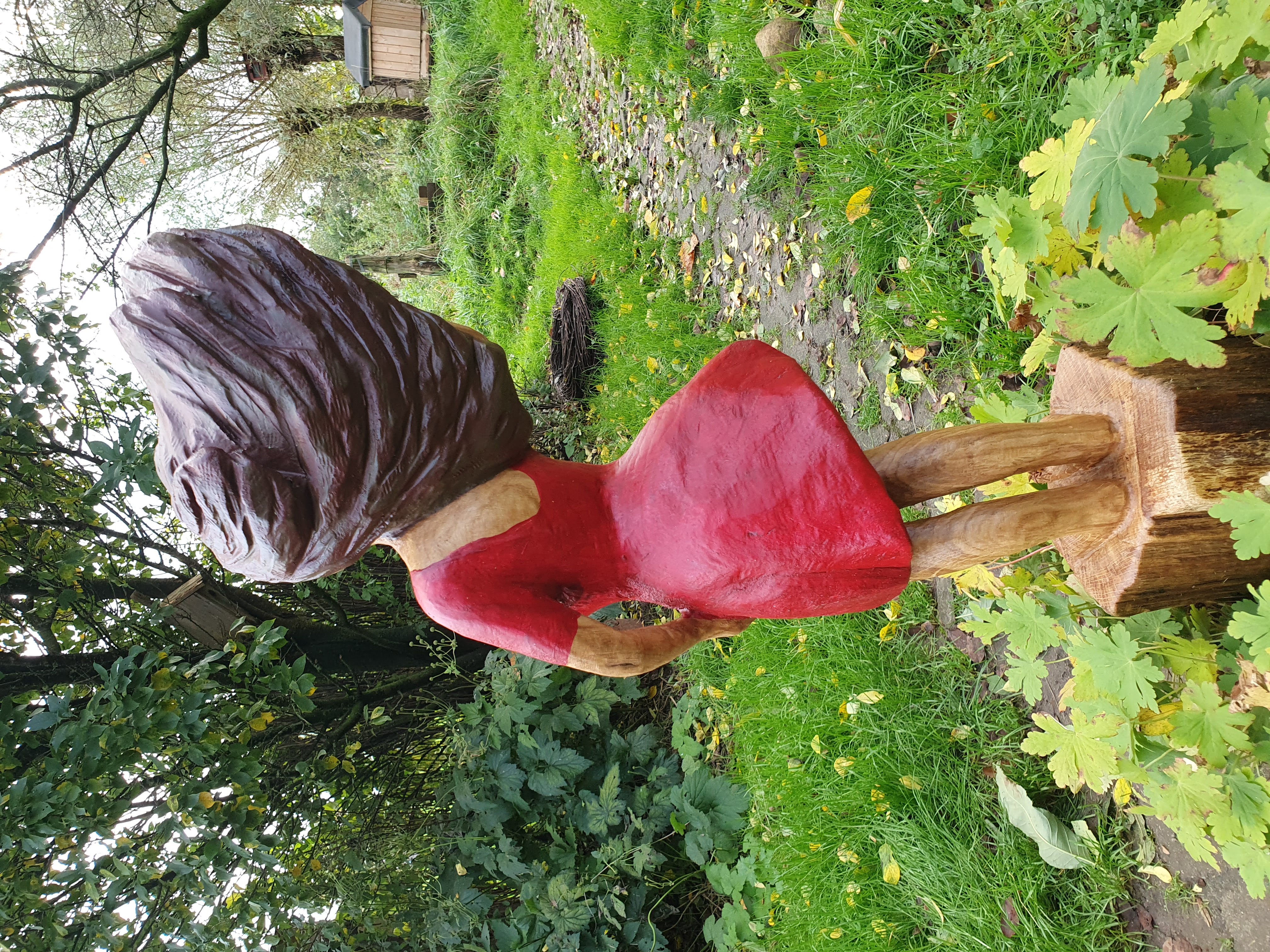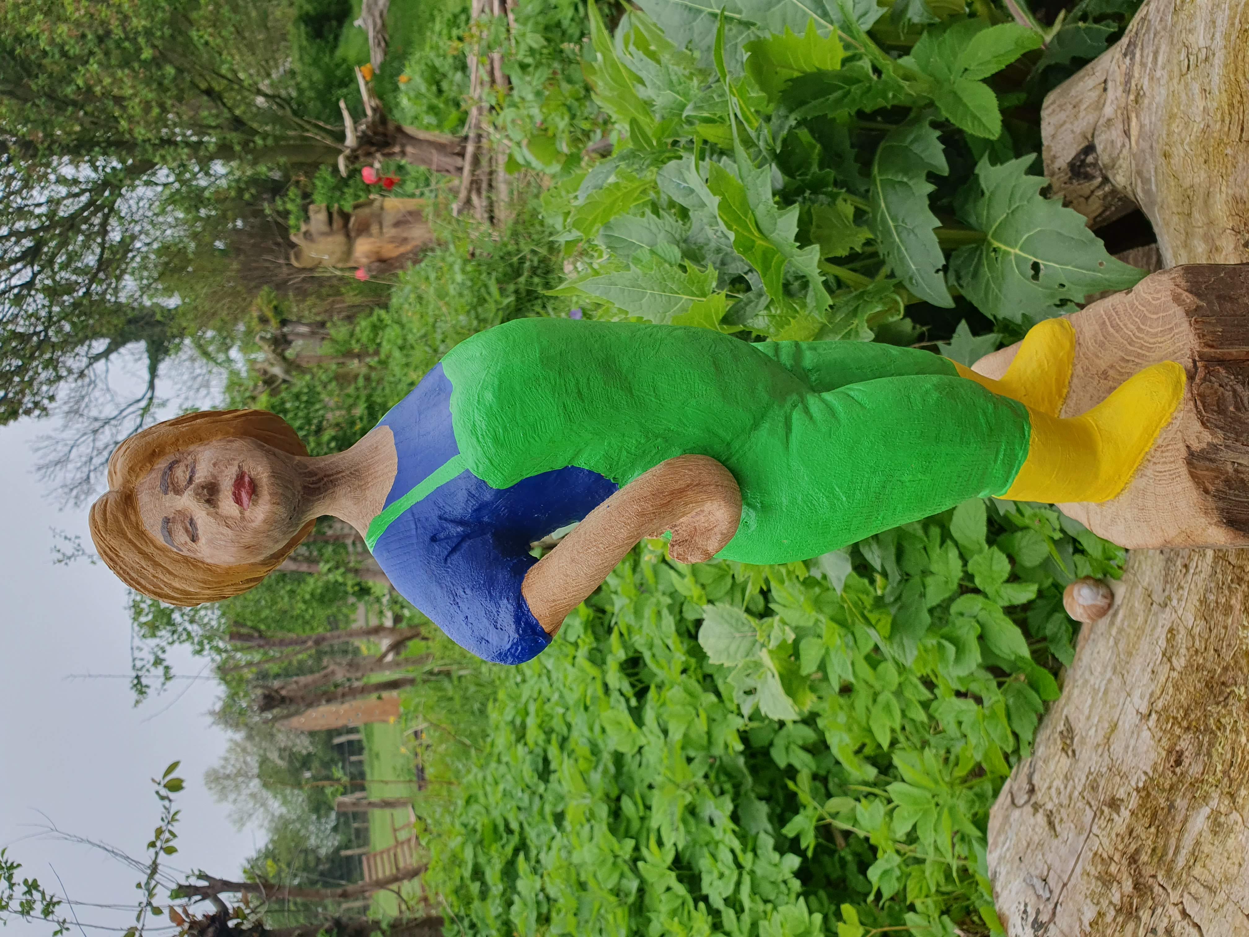 Meine Holzskulpturen zeigen die Menschen der Küste, selbstbewusste Landfrauen mit wehendem Haar und knorrige Seemänner. Sie tragen meist gelbe Gummistiefel und wirken gelassen und zufrieden. In meiner Werkstatt in Fredesdorf, die in einen weitläufigen Skulpturengarten eingebettet ist, erblicken ständig neue Holzwesen das Licht der Welt, alle mit der Kettensäge aus altem Holz geschaffen.