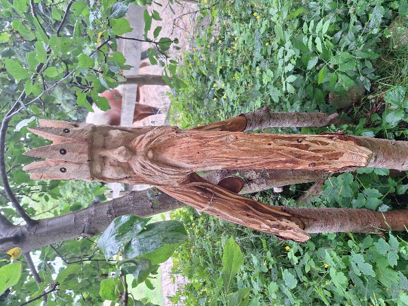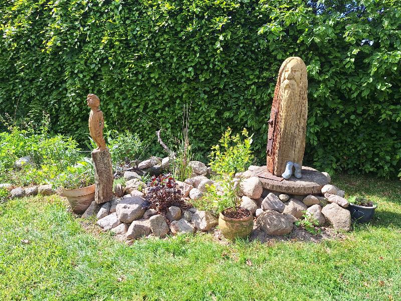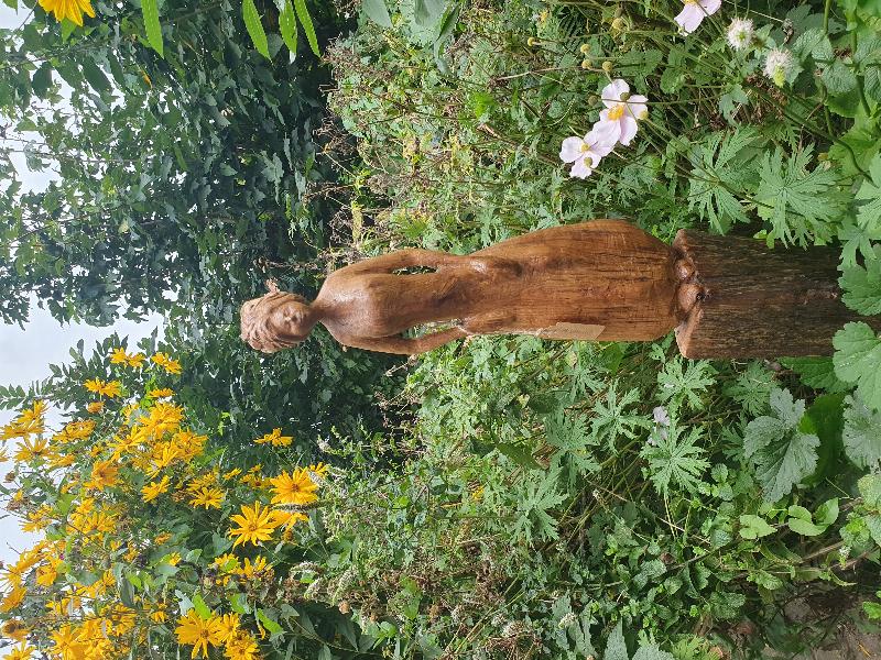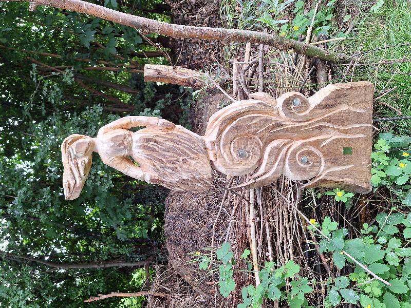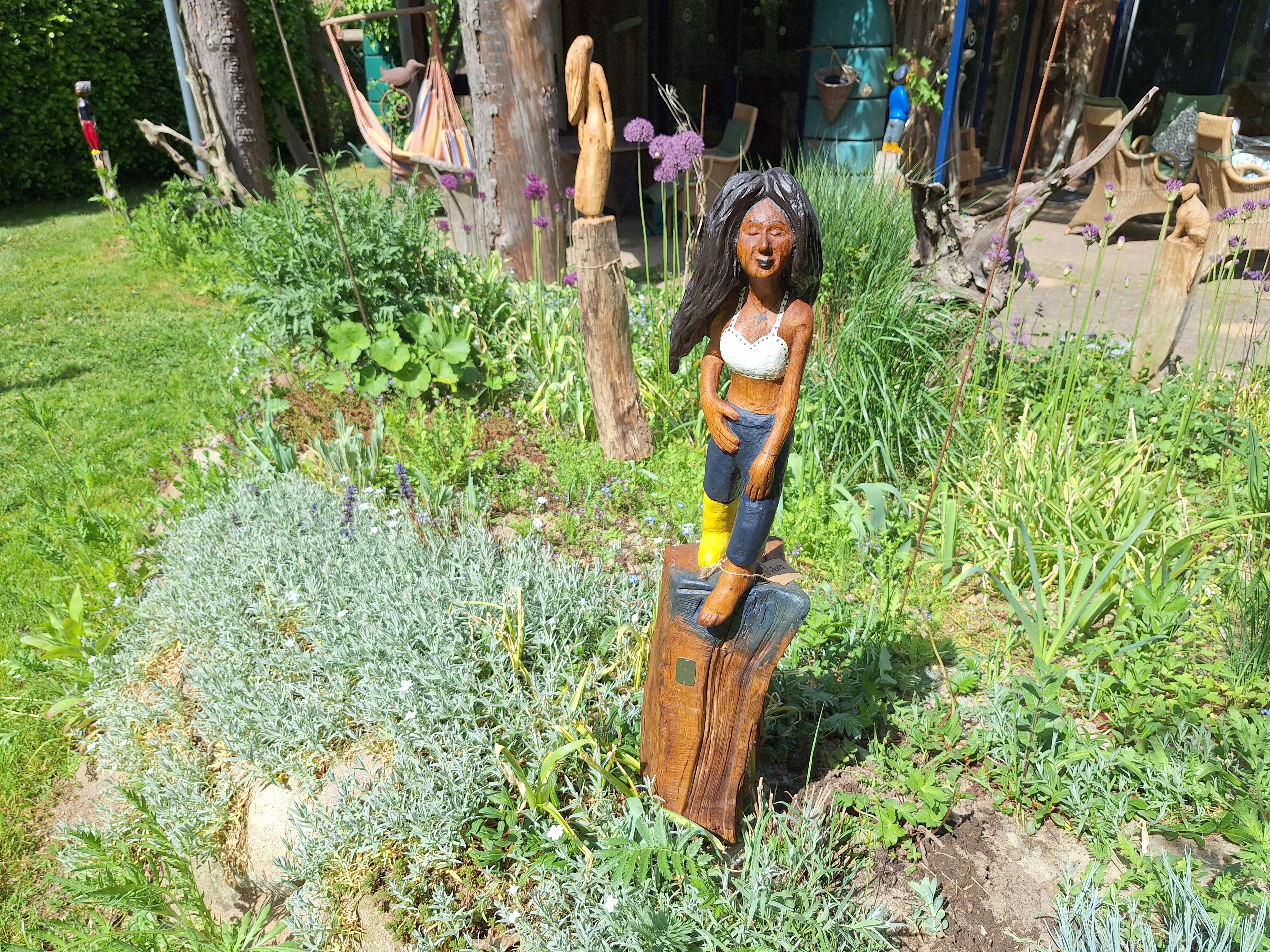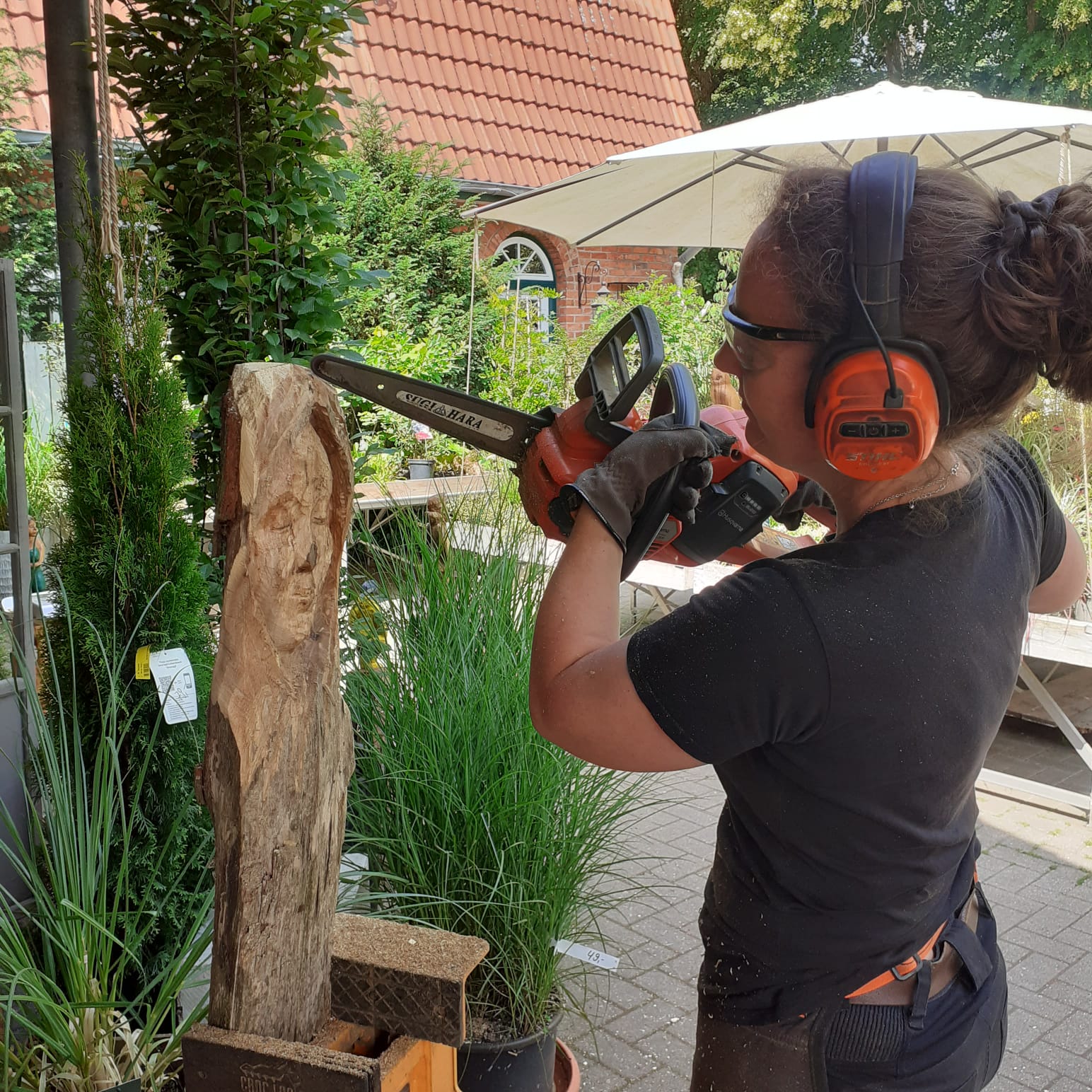 Jeweils um 15 Uhr findet eine Schnitzvorführung mit der Kettensäge statt, bei der Interessierte Steffi Weilkiens über die Schulter schauen und die Entstehung eines Holzkunstwerkes live erleben können. Im weitläufigen Skulpturengarten laden Musik und Kaffee & Kuchen zum Verweilen ein.