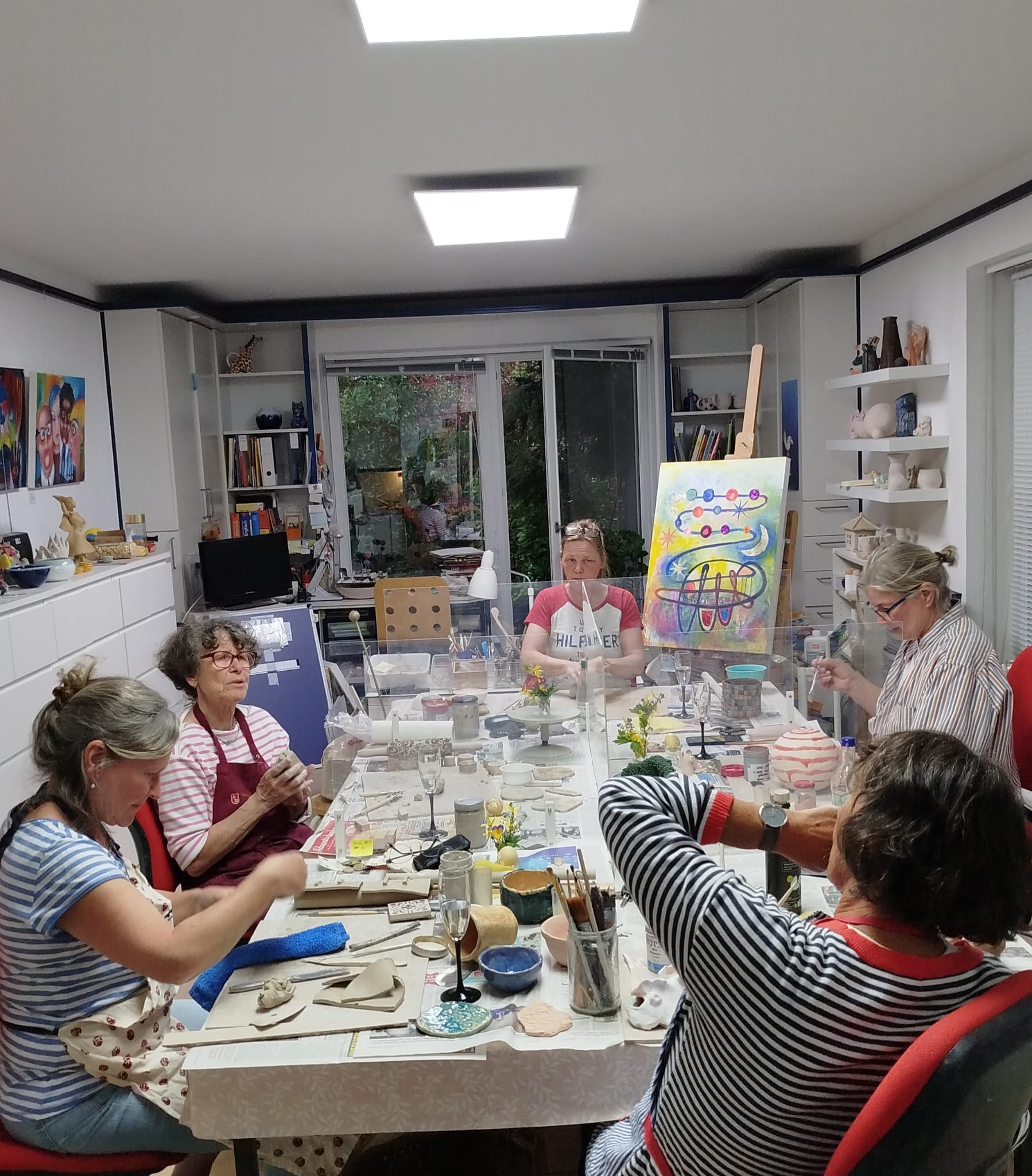 Die Künstlerin lädt Sie herzlich ein, sich umzusehen, Fragen zu stellen – und vielleicht selbst einmal Ton in die Hand zu nehmen und in entspannter Atmosphäre zu klönen und zu töpfern.