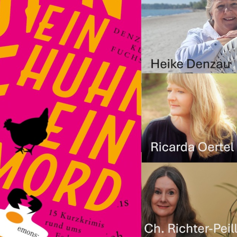 Unter dem Titel „Ein Huhn, ein Mord“ haben Heike Denzau, Anke Küpper und Marie-Christin Fuchs eine Sammlung Kurzkrimis von 18 AutorInnen herausgegeben. Aus dieser Sammlung lesen die Autorinnen Heike Denzau, Charlotte Richter-Peill und Ricarda Oertel.