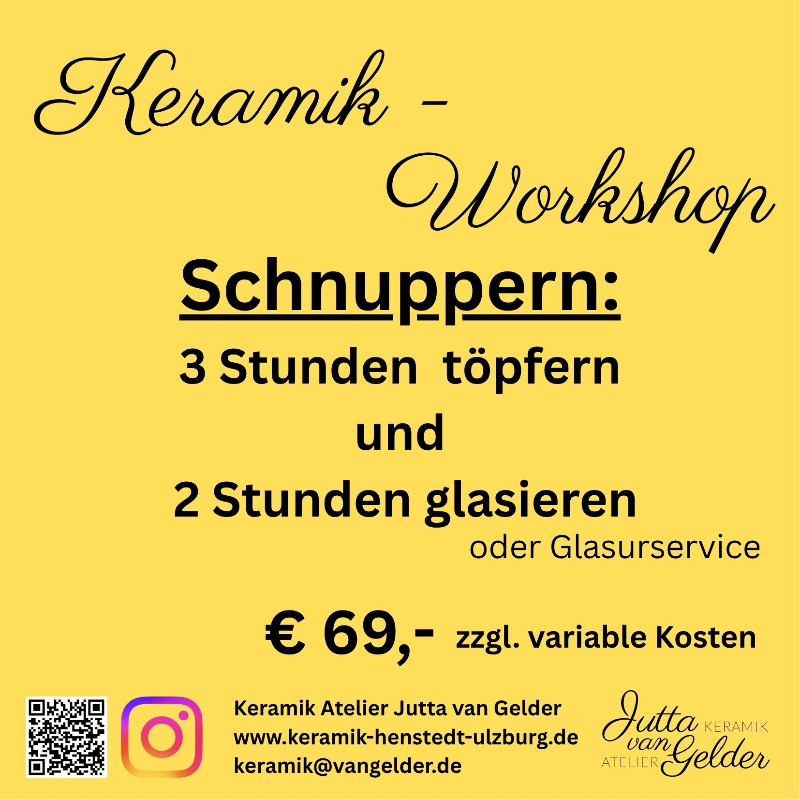 Der Schnupper-Workshop ist für Anfänger und Fortgeschrittene gleichermaßen geeignet. In kleinen Gruppen bis zu 6 Personen wird in netter Atmosphäre mit Blick in den Naturgarten getöpfert. Ca. 3-4 Wochen nach dem Töpfertermin findet der Glasurtermin statt.