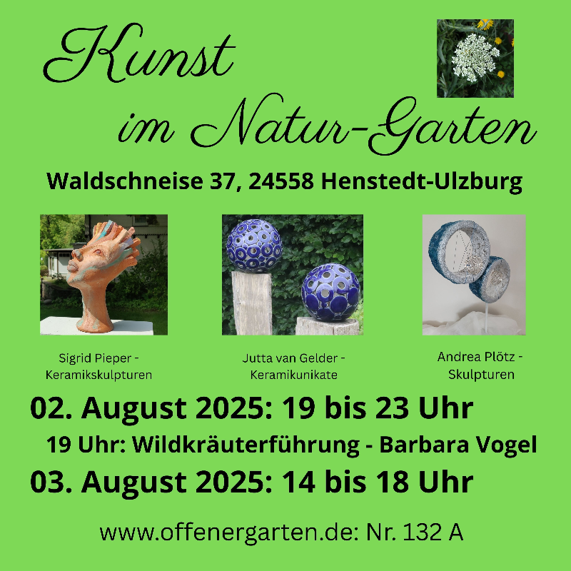Im Rahmen der Aktion offener Garten stellen die Künstlerinnen ihre Unikate aus. Eine besondere Atmosphäre bietet sicherlich der Samstagabend - die lange Nacht der offenen Gärten in Schleswig-Holstein und Hamburg.