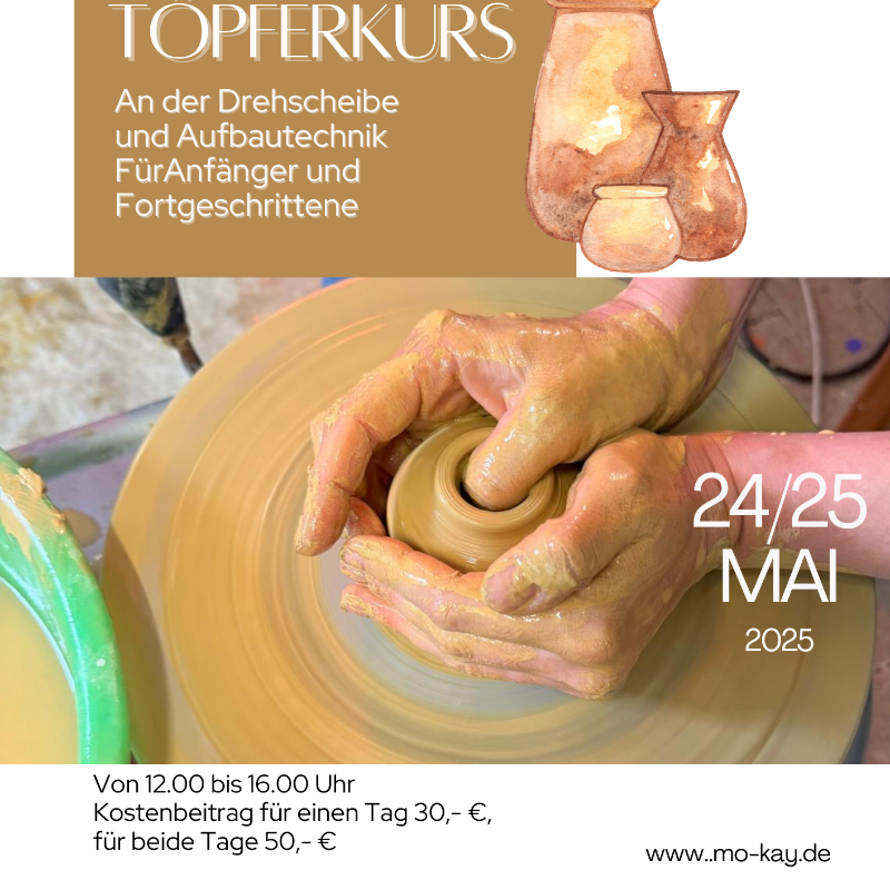 Der Workshop findet statt: 5.9.25 von 19-23 Uhr, 6.9.25 von 13-18 Uhr und am 2.11.25 von 14-18 Uhr (Glasurtermin). In kleinen Gruppen bis zu 6 Personen wird in netter Atmosphäre mit Blick in den Naturgarten getöpfert.