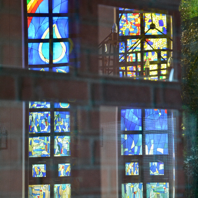 Der Innenraum der 1995 errichteten Naher Kirche strahlt durch seine farbigen Glasfenster in einem besonderen Licht.