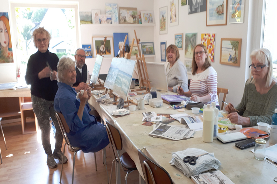 Die Künstler*innen laden zur Besichtigung ihrer Aquarelle, Acryl-, Öl-, Gouache- und Pastellkreidebilder ein. Die Besucher*innen dürfen selbst kreativ werden und kostenfrei munter drauf los experimentieren und gestalten. Heißgetränke und Kuchen runden das Erlebnis ab.