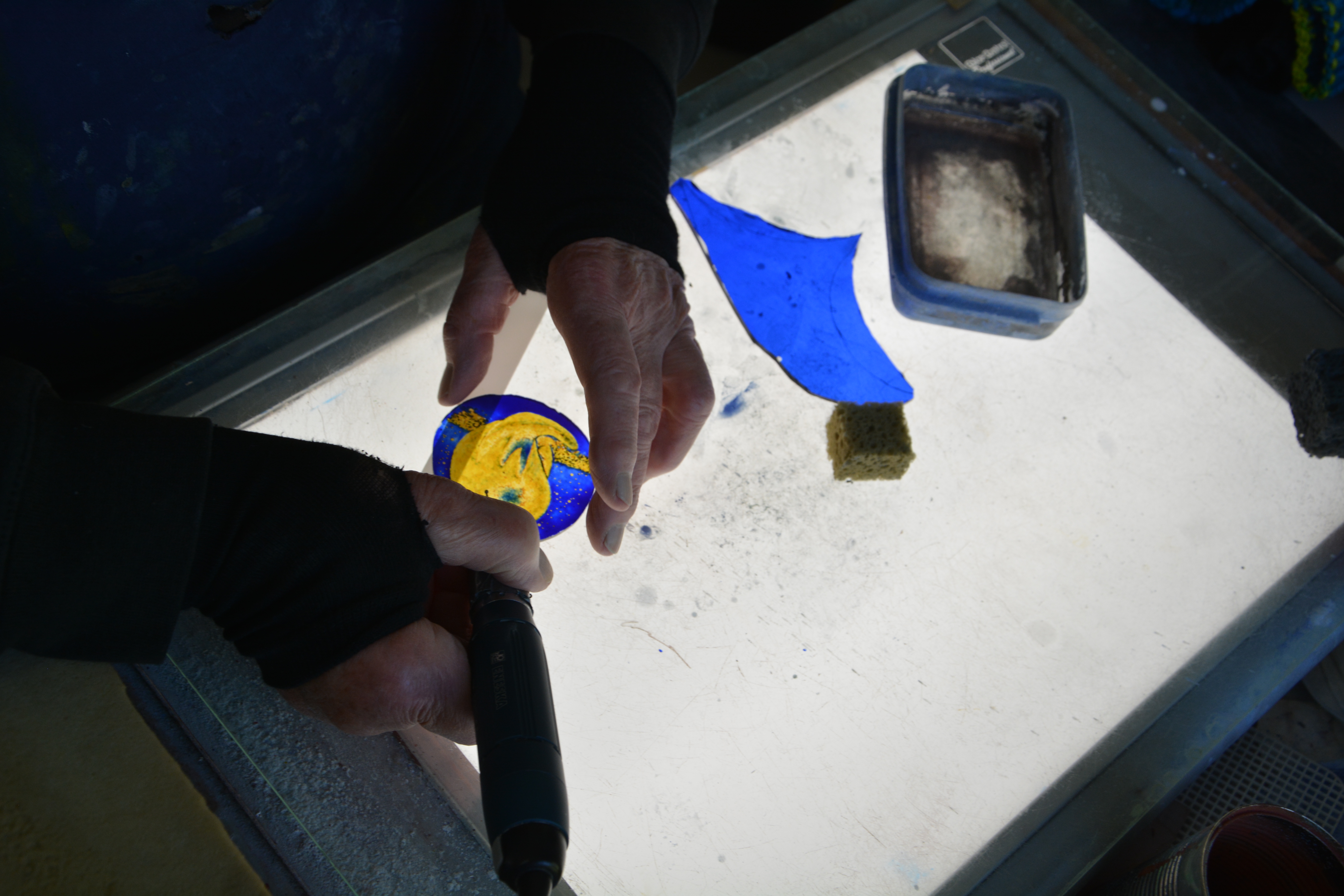 Uwe Fossemer kombiniert mittelalterliche Handwerkskunst mit modernen Schleiftechniken. So ist er in der Lage, auch kleinste Details in seinen Bildern auszuarbeiten und eine ungeahnte Strahlkraft zu erzielen - die Tiefe ganzer Universen wird so auf kleinster Fläche spürbar gemacht.