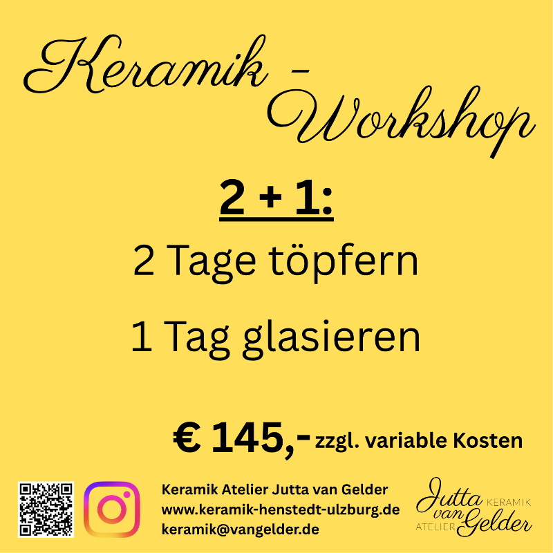 Der Workshop findet statt: 5.9.25 von 19-23 Uhr, 6.9.25 von 13-18 Uhr und am 2.11.25 von 14-18 Uhr (Glasurtermin). In kleinen Gruppen bis zu 6 Personen wird in netter Atmosphäre mit Blick in den Naturgarten getöpfert.