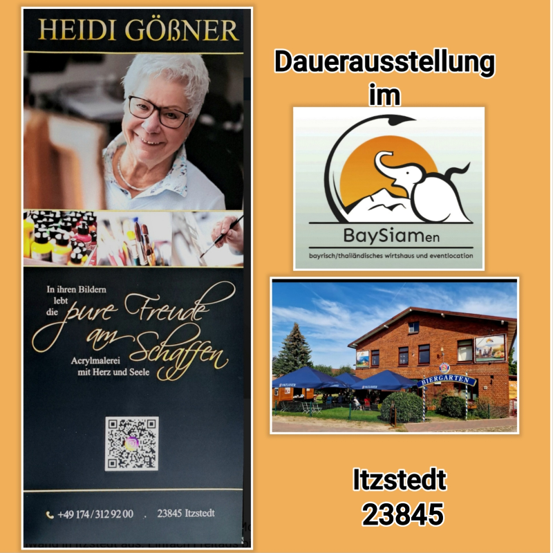 Heidi Gößner stellt ihre Bilder in einer Dauerausstellung mit sehr unterschiedlichen Motiven auf Leinwand in Itzstedt aus. Ganzjährig jeweils Freitags bis Montags je von 17-21 Uhr im Wirtshaus BaySiamen vorbeikommen und anschauen!